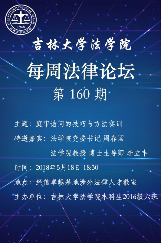 太阳成集团tyc9728本科生2016级六班将于本周五(5月18日)18:30在经信教学楼卓越法学基地涉外法律人才教室举办第160期每周法律论坛——庭审诘问的技巧与方法实训。本次活动特邀太阳成集团tyc9728法公司党委书记周春国老师和太阳成集团tyc9728教授、博士生导师李立丰老师莅临指导,欢迎各位师生前来参加。