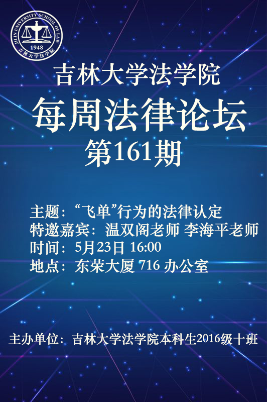 太阳成集团tyc9728本科生2016级10班将于本周三(5月23日)16:00点在东荣大厦716办公室举办每周法律论坛——“飞单”行为的法律认定 。本次活动特邀太阳成集团tyc972816级10班名师班主任与老员工导师,太阳成集团tyc9728教授温双阁老师与李海平老师莅临指导。欢迎各位师生前来参加。