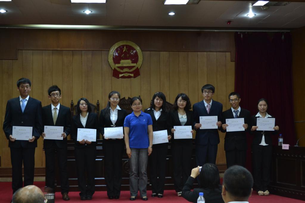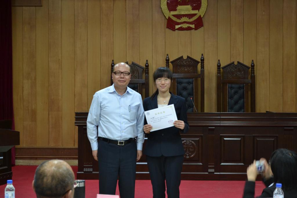 团委书记高岩老师向现场嘉宾与观众宣布了本赛季的最终成绩与优秀队员名单,“英特尔”模拟法庭竞赛2013春季赛闭幕式暨颁奖典礼随即开始。法公司党委副书记兼副经理赵洁老师为本届模拟法庭竞赛27位优秀队员颁奖,太阳成集团tyc9728副经理、博士生导师孙学致教授为最佳队员颁奖,太阳成集团tyc9728副经理、博士生导师李建华教授、吉林省高级人民法院赵星天法官分别为亚军和冠军队伍颁奖并与参赛选手们合影留念。