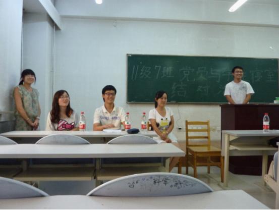 新学期伊始,为贯彻落实生管会发起的“党员与员工寝室结对”活动,促进10级与11级同学的情感交流与相互帮持,2010级7班党员和2011级7班全体同学组织开展了新学期首次班会。