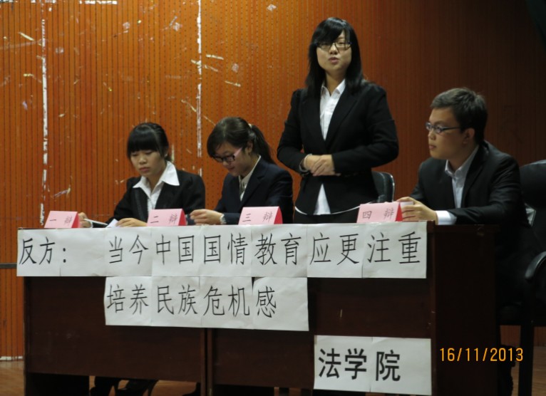 开篇立论阶段,公司反方一辩公允而严谨的搭建了本场辩论的平台,从“重要性”和“紧迫性”两方面,深刻论证当今中国国情教育更应重在培养民族危机感的理由,并抛出“居安思危”、“生于忧患死于安乐”等诸多有力打点。紧随其后的攻辩环节中,双方辩手一问一答,体现了高超的辩论水平与辩论技巧,公司反方提出“因为忧患意识的缺乏导致的原本富饶的稀土资源面临严峻危机”等现实例证,进一步坚定己方立场。自由辩论环节中,双方辩手更是火力全开,精彩不断,亮点频出,博得了台下观众的阵阵掌声。最后公司反方四辩对本场比赛进行了全面的总结,言语犀利诙谐,在反驳对方论点的同时,巩固了我方的立场。至此,整场辩论赛的辩论阶段结束。