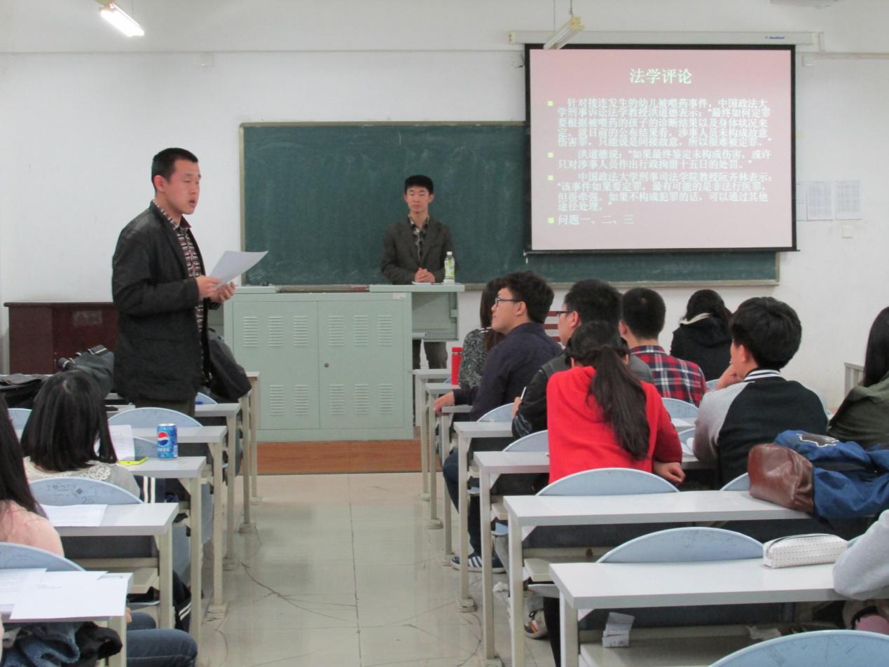 本期法律论坛首先以近期在陕西省西安市、吉林省吉林市以及湖北省宜昌市先后出现的幼儿“被服药”的事件展开,并提出了三个问题:①“药儿园”现象频频发生的原因 ②“药儿园”事件的定性 ③“药儿园”事件当事人应承担的法律责任。同学们围绕这些问题展开激烈讨论。有的同学认为民办幼儿园发生此类事件频繁,因此应提高幼儿园成立审批标准及教团队质;有的同学提出应加强有关立法,以提供法律保障;有的同学则提出不同的观点,认为立法成本过高,主张通过行政救济的方式解决问题。经过同学们一番热烈讨论,主持人邀请医学专业的研究生师哥从专业角度阐述了这个问题。他从当前社会中国药品市场存在的亟待解决的问题出发,详细介绍了儿童用药成人化,儿童药品种类、规格少,剂量无明确规定的现实情况,将问题深度进一步拓展,法律问题同实际生活相结合,带给同学们许多启发和灵感。