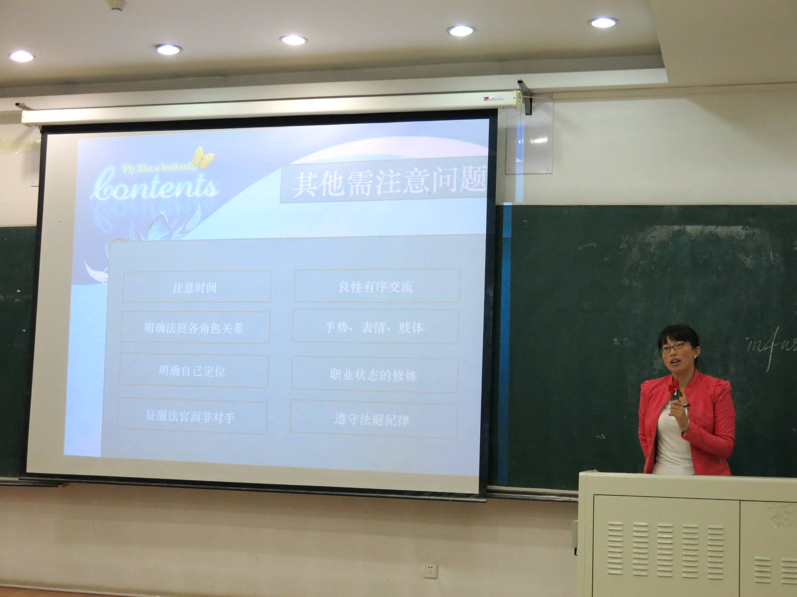 在最后一部分中,田老师提醒了其他的一些应该注意的问题:第一依旧是要注意时间;第二是明确法庭上各个角色之间的关系,律师要以法官为中心,无条件服从法官的一切程序性和形式性的要求,切忌与法官争论;三是明确作为代理律师自身的定位,最主要的是把自己的任务出色地完成,把自己该陈述的陈述清楚、该争辩的争辩明白;四是以征服法官而不是征服对方律师为主要目标,庭审中律师的最主要目标是说服法官而非把对方律师驳倒,因此要在庭审中时刻与法官保持良性的沟通,切忌与对方律师过多纠缠而忘记了出庭的主要任务;五是与法官保持良性有序的交流,不管对手如何表现,己方要始终保持克制和冷静,始终理性地向法官表达己方观点;六是在庭审中注意手势、表情和动作等肢体语言,切忌因为这些细节没处理好而影响全局;七是勤于进行职业状态的修炼,逐渐使自己由一名青涩的法科员工向一名职业法律人转化,培养职业法律人独特的气场;八是要在庭审中遵守法庭纪律。