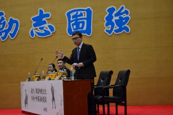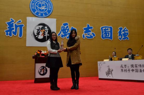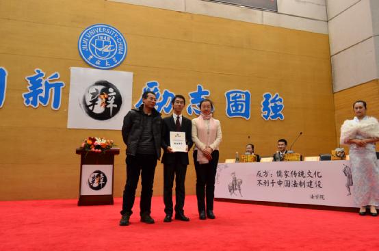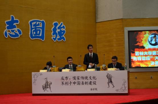接下来双方一辩分别围绕两方观点做了精彩的开篇立论,引出了各自的观点,正方强调儒家传统文化并非主导中国法制建设而是辅助法制建设,只要能起到一定的积极作用就是有利于法制建设;而反方则指出了儒家文化背后的等级秩序观、人性本善观及义务本位观等等核心理念都与现代法治社会背道而驰。针对此,双方就儒家传统文化的定义及核心等在攻辩阶段进行了激烈的交锋,双方二辩三辩都展示了超凡的逻辑思辩能力,反方辩手在回答中以两次世界大战促进了世界和平事业的发展,但这并不能代表战争有利于和平类比,明确指出了正方所谓儒家文化的一点点好处就有利于法制建设的逻辑站不住脚。在一番牛刀小试之后,最精彩的短兵交接环节也如约而至,报告厅内融融的热情将比赛推向高潮。正方提出对儒家文化的扬弃主张,针对于儒家文化的部分辅助即是有利于向反方提出质疑,同时提出中国法制的特色应于传统文化结合的观点;反方亦不甘示弱,以法律性本恶和儒家性本善理论,针对法治与人治的本质区别和核心根基,以权利本位和义务本位的价值思想分歧向对方提问。而在总结陈词环节中,反方四辩的总结陈词幽默风趣,在大家的哈哈一笑中再度证明了本方观点;随着正方四辩朴实无华的总结陈词过后,比赛环节进入了尾声。评委退场公议。