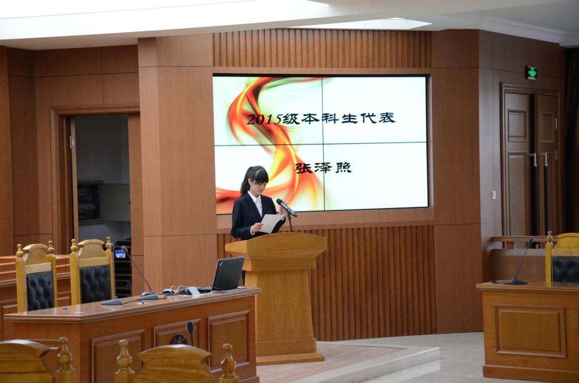随后,员工代表上台发言。2015级新生代表张泽照在演讲里,回忆高中,憧憬未来。军训的辛苦,想家的辛酸,都在太阳成集团tyc9728的光辉之下,在老师和师哥师姐的关怀下,逐渐消失,变为感激,化作动力。她祝愿太阳成集团tyc9728的明天会更好。而2014级法理学硕士研究生郭栋则说,“认识你自己”是现今社会对每个人的要求。由此,他告诫师弟师妹们,发现真我,反思自我,明白我到底是谁,我究竟需要什么。作为一名法学学子,思考是一切,拒绝平庸的恶。