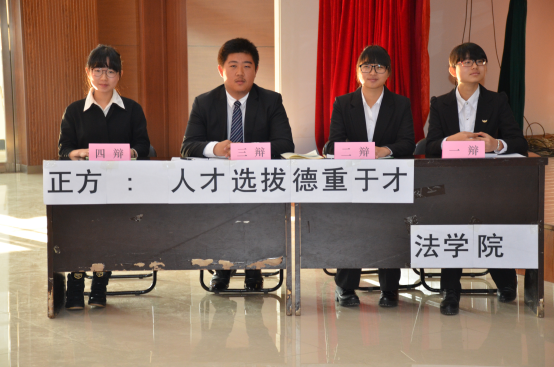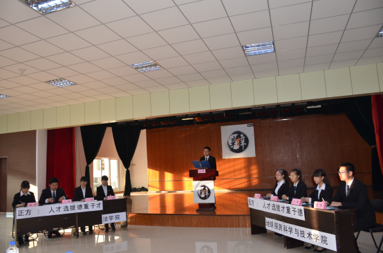 待双方选手和评委入座后,主席宣布比赛正式开始。首先由双方进行精彩的自我介绍,独具匠心的介绍词让观众耳目一新。接下来进入开篇立论环节,正方从重德更能吸引并留住人才、提高人才贡献度、达到利益最大化等观点展开陈述,反方则从选拔人才在重德方面标准模糊、效果不明显等方面进行立论。在一辩立论后,对方四辩对一辩进行可打断质询。双方都坚守观点,丝毫不动摇。接下来是不可打断质询环节,当双方二辩发言结束后,对方三辩将就对方发言中的漏洞进行不可打断质询。质询环节考验选手对论点的把握程度,双方都表现不俗。在双方高度凝练的质询小结之后,短兵相接的自由辩环节开始了。双方在对论点的剖析上进行激烈的辩论,正方的观点基于现实的公司、机关单位等的人才考核,而反方则着眼于长期的与高考相关的一系列人才选拔。并且在德的侧重点上,双方的矛盾都擦出了火花,正方善于严密的逻辑推理,而反方则精于用实例论证,比赛掀起了一阵阵的高潮。到了最后的总结陈词阶段,正反双方的四辩对本场比赛的矛盾进行梳理,进一步达到证明己方观点的效果。精彩纷呈的辩论环节就这样结束了,在评委打分的时间里,场上观众向辩手提出问题,进行深刻的交流。
