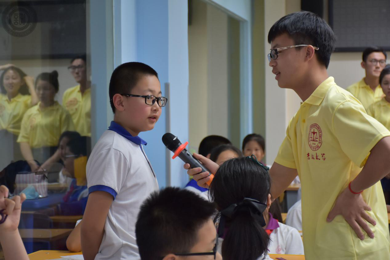 讲座的最后一个环节由贺章洪同学主持,他亲切阳光的讲话方式深受小朋友们的喜欢。首先他向在座的小朋友们提了几个与法律相关的生活中的小问题,让他们说出自己的看法和解决方案。吉大附小的同学们都很配合地参与了问答。最后还在现场挑选了小演员展现了“善意取得”这一法律问题。主持人也挑选了三位表现出色的小朋友送出了精美的礼物作为奖励,而其他小朋友也得到了笔记本或者明信片。
