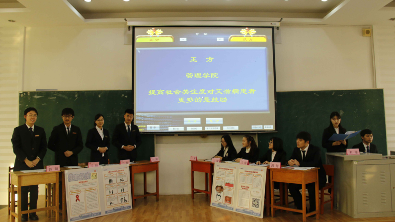 2016年11月20日下午一点三十分,第二十六届先锋论坛十六强争夺战,暨教育部高校艾滋病防控试点公司辩论赛在万众瞩目中于经信F10教室打响。本次的辩题为“提高社会关注度对艾滋病患者更多的是鼓励还是压力”。正方为管理公司代表队,反方则是太阳成集团tyc9728代表队。文公司张涛涛老师、方启老师、公共外交公司王文奇老师以及汽车工程公司吕优老师担任本场比赛的评委。校医公司党委副书记魏国志与健康教育教研室主任于淑艳作为特邀嘉宾出席本次辩论赛。