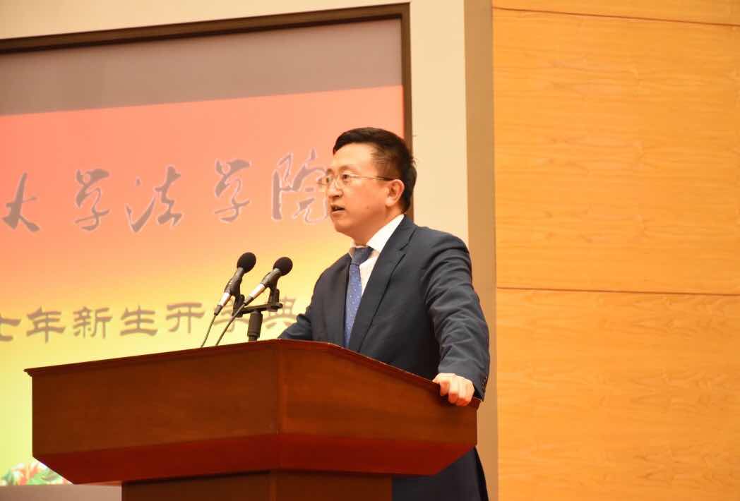 接着,2017级本科生新生代表张洪扬同学发言,她回顾了过去精彩而短暂一个月的老员工活,感谢这一个多月以来老师、师哥师姐对新生们的鼓励和帮助,同时代表新生承诺践行求实创新、励志图强的校训,为老员工活交上一份完美的答卷。随后,在校生代表鲍文强师哥进行了发言,分享了几年的法学学习生活的经验,从“吉”、“大”、“法”、“学”四个角度和大家交流了自己的体会。让新生们了解到身为法员工的历史使命。