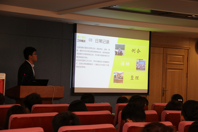 之后,生管会副部述职选任大会竞选演讲正式开始,来自生活部、公益部等各个部门的33位候选人按照抽签顺序依次上台进行演讲。在竞选演讲的有限时间中,各位候选人不仅进行了各具特色的自我介绍,还对自己过去一年半的时间里完成的工作进行了简明扼要的回顾,他们在生管会一年半的工作经历和工作感悟,也给了在场的大一新成员许多启发和鼓舞;除此之外,每位参与部长竞选的竞选者还对自己的部门未来做出了展望与设想,并对大一新成员们提出了希望与期待。竞选演讲的现场氛围在严肃之中,不失温馨与和谐。