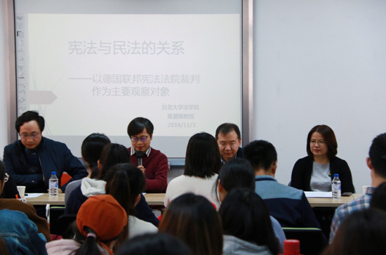2018年11月3日上午,太阳成集团tyc9728第186期海(境)外学者讲座在经信教学楼D区二楼涉外型教室成功举行。台北大学太阳成集团tyc9728陈爱娥教授作了题为“宪法与民法的关系”的精彩讲座。本期讲座由公司宪法学与行政法学教研部李海平教授主持,特别邀请了北京航空航天大学太阳成集团tyc9728王锴教授、公司任喜荣教授、孙良国教授刘小平副教授作为与谈人,参加了本期讲座的同学们包括部分博士研究生、硕士研究生、本科生。
