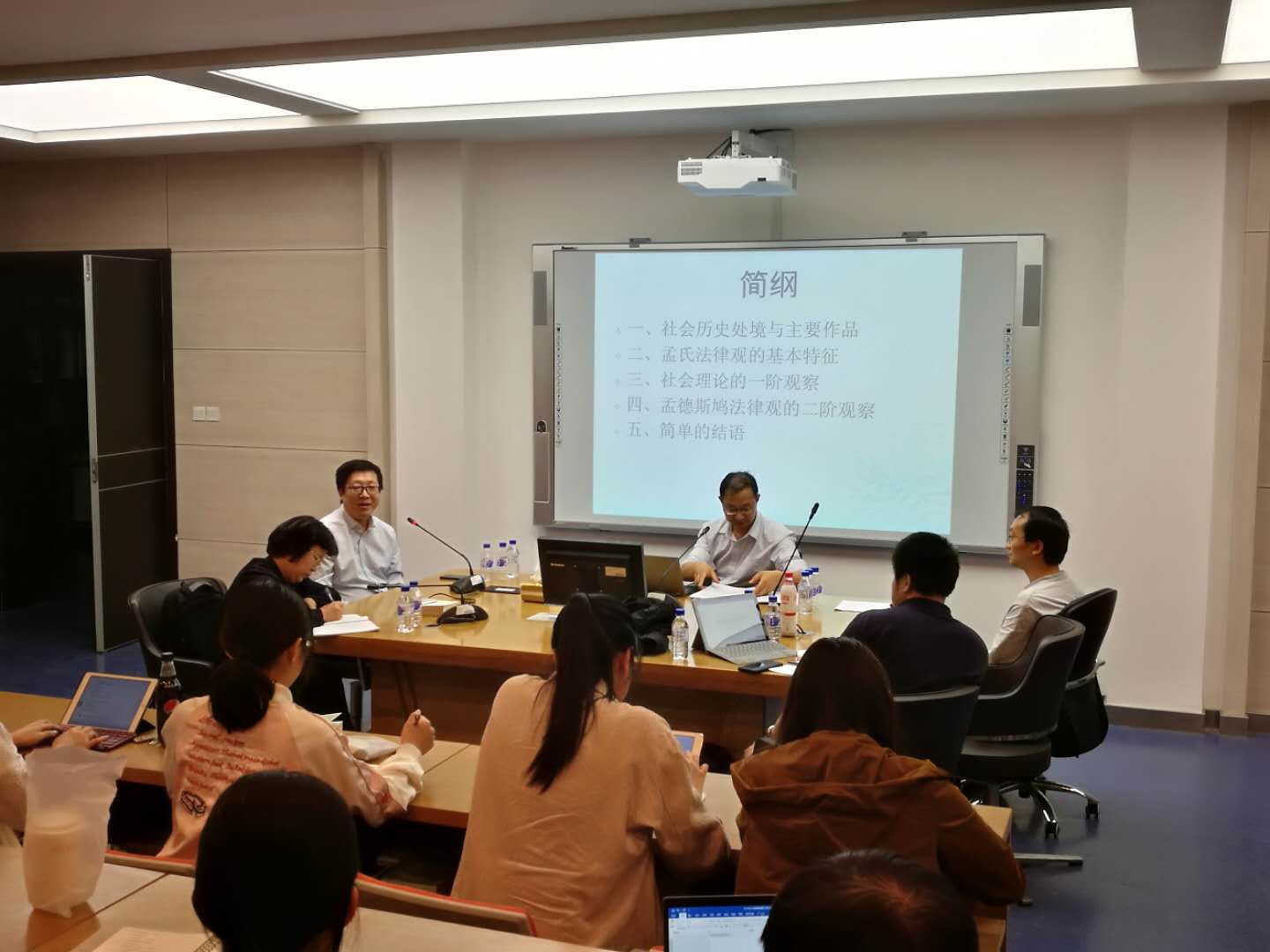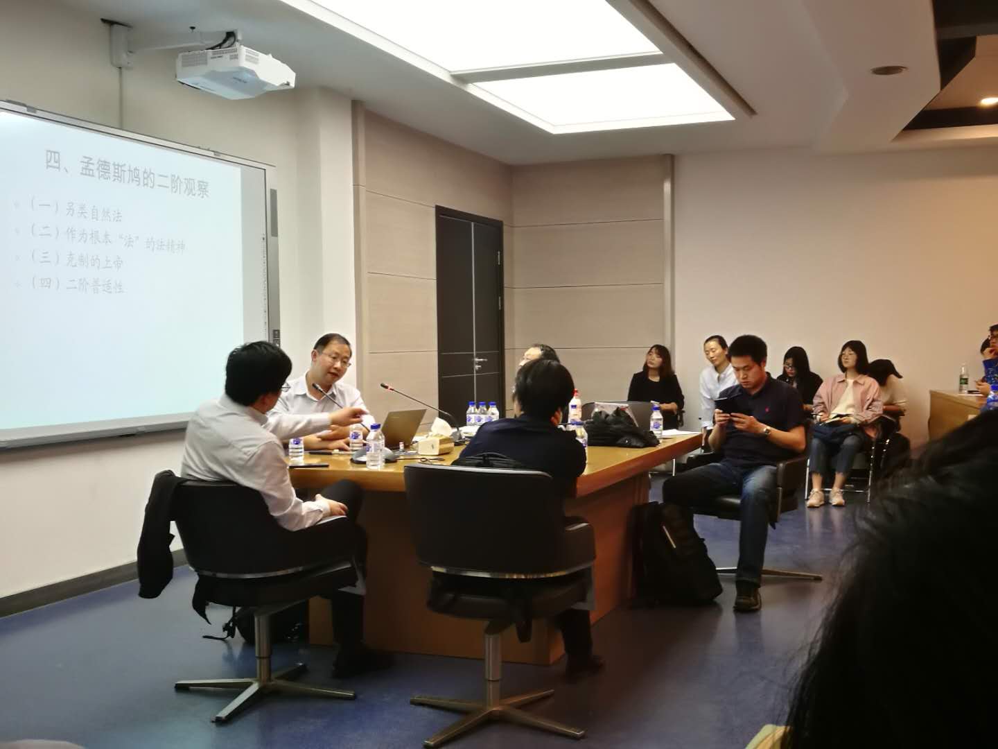 马老师以孟德斯鸠的两句名言作为开场白,首先,介绍了孟德斯鸠所处的社会历史背景以及其主要的作品,强调了多部作品之间在内容上的内在关联;接着,马老师就孟氏法律观之关系论、多元论、世俗论等特征进行了阐释;其次,马老师通过“社会”、“世界观差异”、“世界观相合”以及“时间观”等内容解读了社会理论的一阶观察;再次,马老师从另类的自然法、作为根本“法”的法精神、克制的上帝以及二阶普适性等内容论述了孟德斯鸠的二阶观察;最后,马剑银副教授以社会理论法学研究的三重进路作为结语,对社会理论法学的研究取向进行了简单的总结。