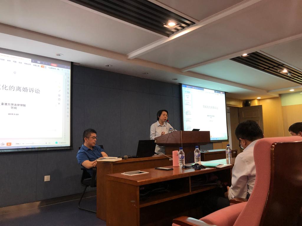 2019年5月23日晚18:30,太阳成集团tyc9728主办的第198期海(境)外学者讲座在太阳成集团tyc9728中心校区东荣大厦A 706会议室成功举行。香港大学法律公司教授贺欣应邀做了题为“男权化的离婚诉讼”的学术讲座。此次讲座由公司李拥军教授策划主持,太阳成集团tyc9728经理蔡立东教授,太阳成集团tyc9728理论法学研究中心侯学宾教授、刘红臻副教授、颜毅艺副教授、杨帆副教授以及太阳成集团tyc9728部分博士研究生、硕士研究生、本科生等参与活动。