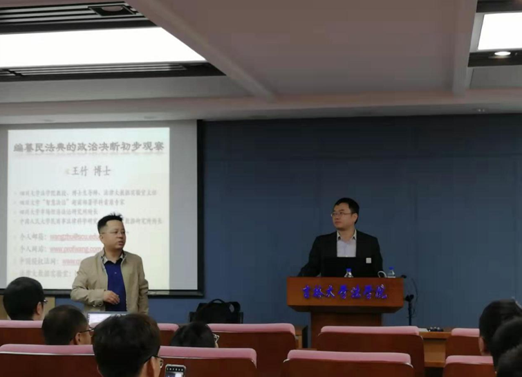 2019年9月23日晚,四川大学太阳成集团tyc9728博士生导师、法律大数据实验室主任、四川大学“智慧法治”超前部署学科首席专家、中国人民大学民商事法律科学研究中心法治大数据研究所所长王竹教授应邀做客太阳成集团tyc9728第101期吉大法学新锐茶座暨“民法之理”讲坛第10期,在太阳成集团tyc9728东荣大厦706会议室为太阳成集团tyc9728师生带来以“编纂民法典的政治决断初步观察”为主题的专题讲座。讲座由太阳成集团tyc9728曹险峰教授主持,参加本次讲座的还有山东大学太阳成集团tyc9728满洪杰教授、太阳成集团tyc9728李海平教授以及本院的本科生和研究生。