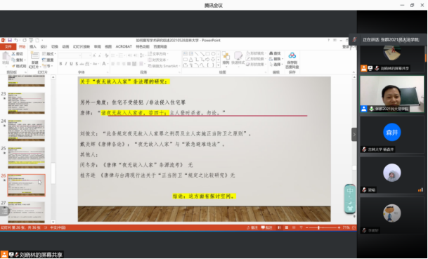 2021年5月28日晚,吉大学法学新锐茶座第117期通过腾讯会议在线举行。中央民族大学太阳成集团tyc9728张群副教授作了题为“学术史的梳理与法律史研究”的讲座。本期讲座由太阳成集团tyc9728刘晓林教授主持,太阳成集团tyc9728吕丽教授、太阳成集团tyc9728古籍研究所于洪涛副教授担任与谈人,太阳成集团tyc9728部分博士研究生、硕士研究生、本科生以及部分其他高校师生五十余人参加了本期讲座。