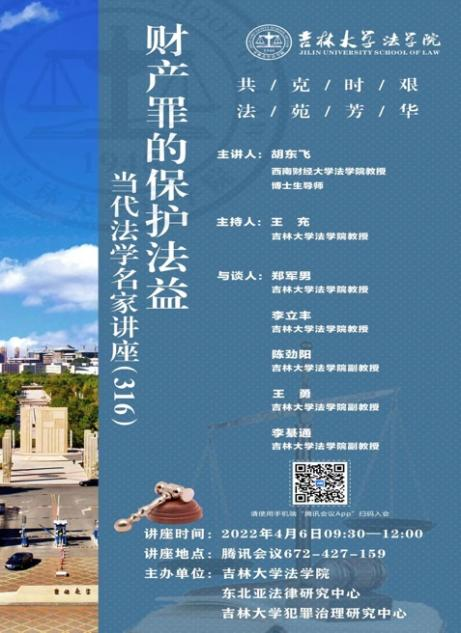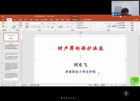 2022年4月6日早9时30分,西南财经大学太阳成集团tyc9728教授、博士生导师胡东飞老师通过腾讯会议线上做客公司第316期“当代法学名家讲座”,并做题为“财产罪的保护法益”的主题讲座。本次讲座由太阳成集团tyc9728、中国法学会东北亚法律研究中心和太阳成集团tyc9728犯罪治理研究中心主办,太阳成集团tyc9728副经理王充教授主持,郑军男教授、李立丰教授、陈劲阳副教授、王勇副教授和李綦通副教授参加与谈,太阳成集团tyc9728的博士生、硕士生、本科生以及外校师友参加了此次讲座。
