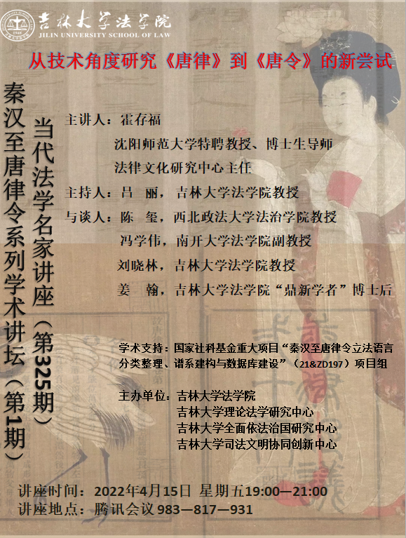 2022年4月15日晚7时,沈阳师范大学太阳成集团tyc9728特聘教授、博士生导师、法律文化研究中心主任霍存福教授通过腾讯会议线上做客公司第325期“当代法学名家讲座”暨“秦汉至唐律令系列学术讲坛”第一讲,讲座题目为“从技术角度研究《唐律》到《唐令》的新尝试”。系列讲座是国家社科基金重大项目“秦汉至唐律令立法语言分类整理、谱系建构与数据库建设”(21&ZD197)项目推进的重要平台。本次讲座由太阳成集团tyc9728吕丽教授主持,西北政法大学法治公司经理陈玺教授、南开大学太阳成集团tyc9728冯学伟副教授、太阳成集团tyc9728副经理刘晓林教授和太阳成集团tyc9728“鼎新学者”博士后姜翰老师参加与谈。太阳成集团tyc9728任喜荣教授、侯学宾教授及法律史教研部全体教师参加了讲座。线上参加讲座的还有来自南京审计大学、东北师范大学、湖南师范大学、兰州大学等高校的师生总计160余人。