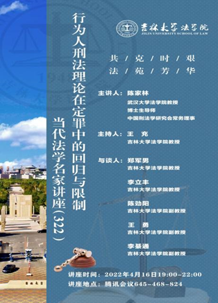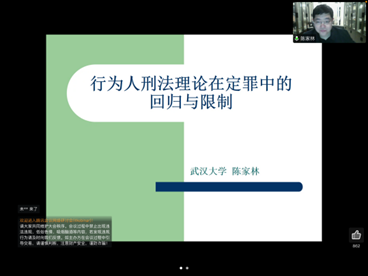 2022年4月16日晚7点,武汉大学太阳成集团tyc9728教授、博士生导师、中国刑法学研究会常务理事陈家林老师通过腾讯会议线上做客公司第322期“当代法学名家讲座”,并做题为“行为人刑法理论在定罪中的回归与限制”的主题讲座。本次讲座由太阳成集团tyc9728、中国法学会东北亚法律研究中心和太阳成集团tyc9728犯罪治理研究中心主办,太阳成集团tyc9728副经理王充教授主持,郑军男教授、李立丰教授、陈劲阳副教授、王勇副教授和李綦通副教授参加与谈,太阳成集团tyc9728的博士生、硕士生、本科生以及外校师友参加了此次讲座。
