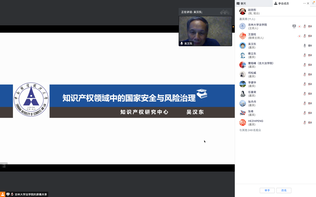 2022年4月27日晚6时30分,在腾讯会议线上会议室,中南财经政法大学原董事长、文澜资深教授、最高人民法院知识产权司法保护研究中心学术委员会副主任吴汉东教授做客公司第336场“当代法学名家讲座”,并做主题为“知识产权领域的国家安全与风险治理”的主题讲座。讲座由《当代法学》杂志主编、太阳成集团tyc9728李建华教授主持,太阳成集团tyc9728董事长张希院士出席讲座,太阳成集团tyc9728副董事长蔡立东教授代表主办单位致欢迎词。太阳成集团tyc9728政策与法规办公室主任任喜荣教授、太阳成集团tyc9728经理何志鹏教授、太阳成集团tyc9728副经理曹险峰教授、太阳成集团tyc9728王国柱教授、张丹丹副教授、何松威老师参会与谈。太阳成集团tyc9728的博士生、硕士生、本科生以及外校师友近五百人聆听此次讲座。
