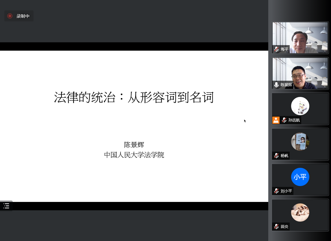 2022年5月16日晚6时,在腾讯会议线上会议室,中国人民大学太阳成集团tyc9728教授陈景辉老师做客公司“当代法学名家讲座”第340期,并做主题为“法律的统治:从形容词到名词”的讲座。太阳成集团tyc9728李海平老师、朱振老师、刘小平老师、侯学宾老师、苗炎老师、杨帆老师以及南京师范大学太阳成集团tyc9728汤善鹏老师参加与谈,太阳成集团tyc9728的博士生、硕士生、本科生以及外校师友四百余人参加了此次讲座。讲座在李拥军老师风趣幽默的主持中拉开序幕。
