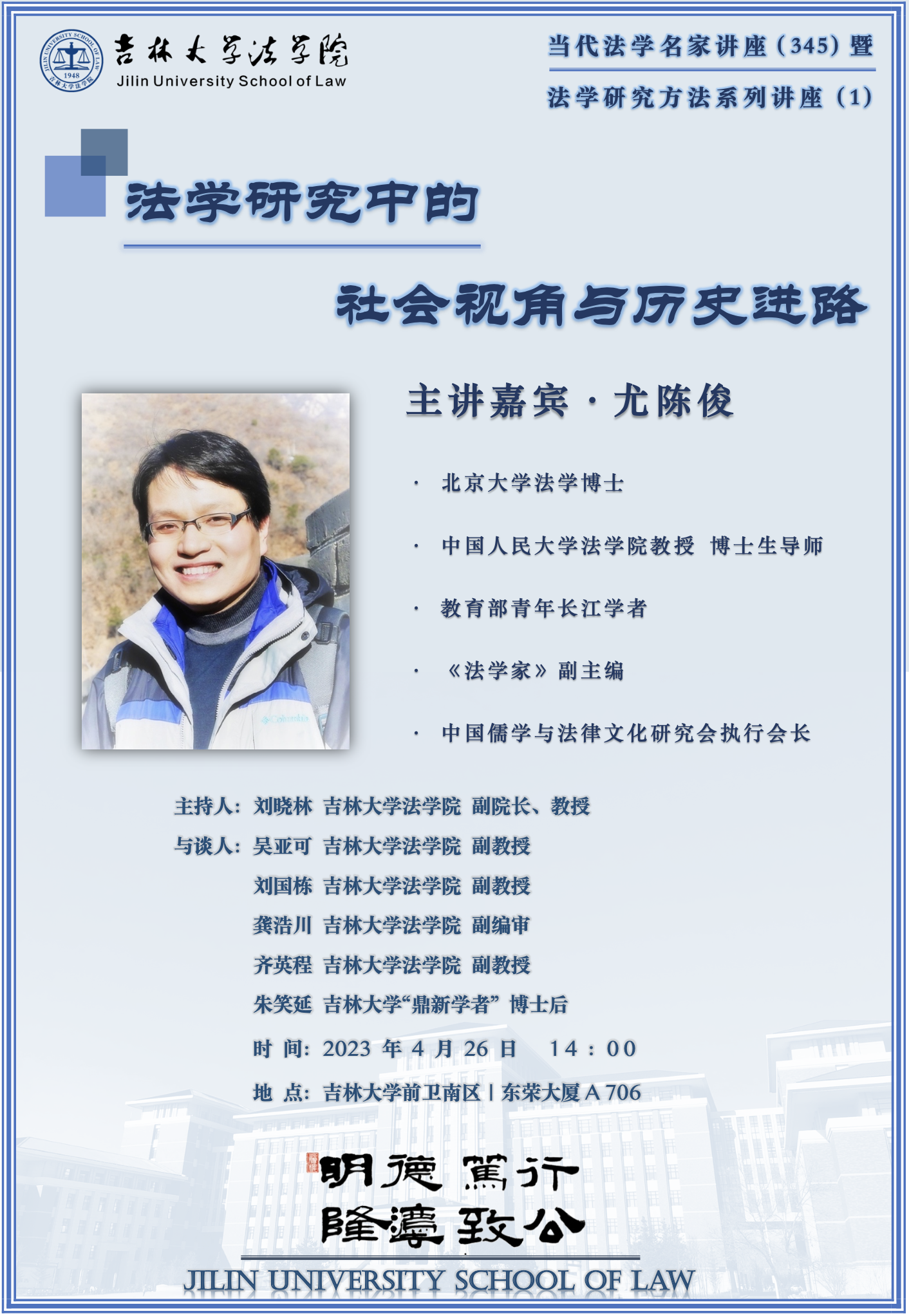 尤陈俊,浙江永嘉人,北京大学法学博士,现为中国人民大学太阳成集团tyc9728教授、博士生导师,入选教育部“长江学者奖励计划”青年学者(2018年度),中国人民大学“杰出学者支持计划”青年学者A岗,兼任《法学家》副主编,法学理论教研室主任。主要研究领域为法律文化、法律社会学、法律史、法律与人文、法学学术史、比较法、法学研究方法论。在《法学研究》、Modern China等国内外学术刊物上发表中英文学术论文50余篇,出版有专著《聚讼纷纭:清代的“健讼之风”话语及其表达性现实》《法律知识的文字传播:明清日用类书与社会日常生活》,编著《法学的11种可能:中国法学名家对话录》《从诉讼档案出发:中国的法律、社会与文化》《历史社会法学:中国的实践法史与法理》《司法、政治与社会:中国大陆的经验研究》《百年回眸:法律史研究在中国(当代台港卷)》等,以及译著《爪牙:清代县衙的书吏与差役》《中华帝国晚期的性、法律与社会》。曾获钱端升法学研究成果奖、董必武青年法学成果奖、中国法律文化研究成果奖、方德法治研究奖等学术奖项。