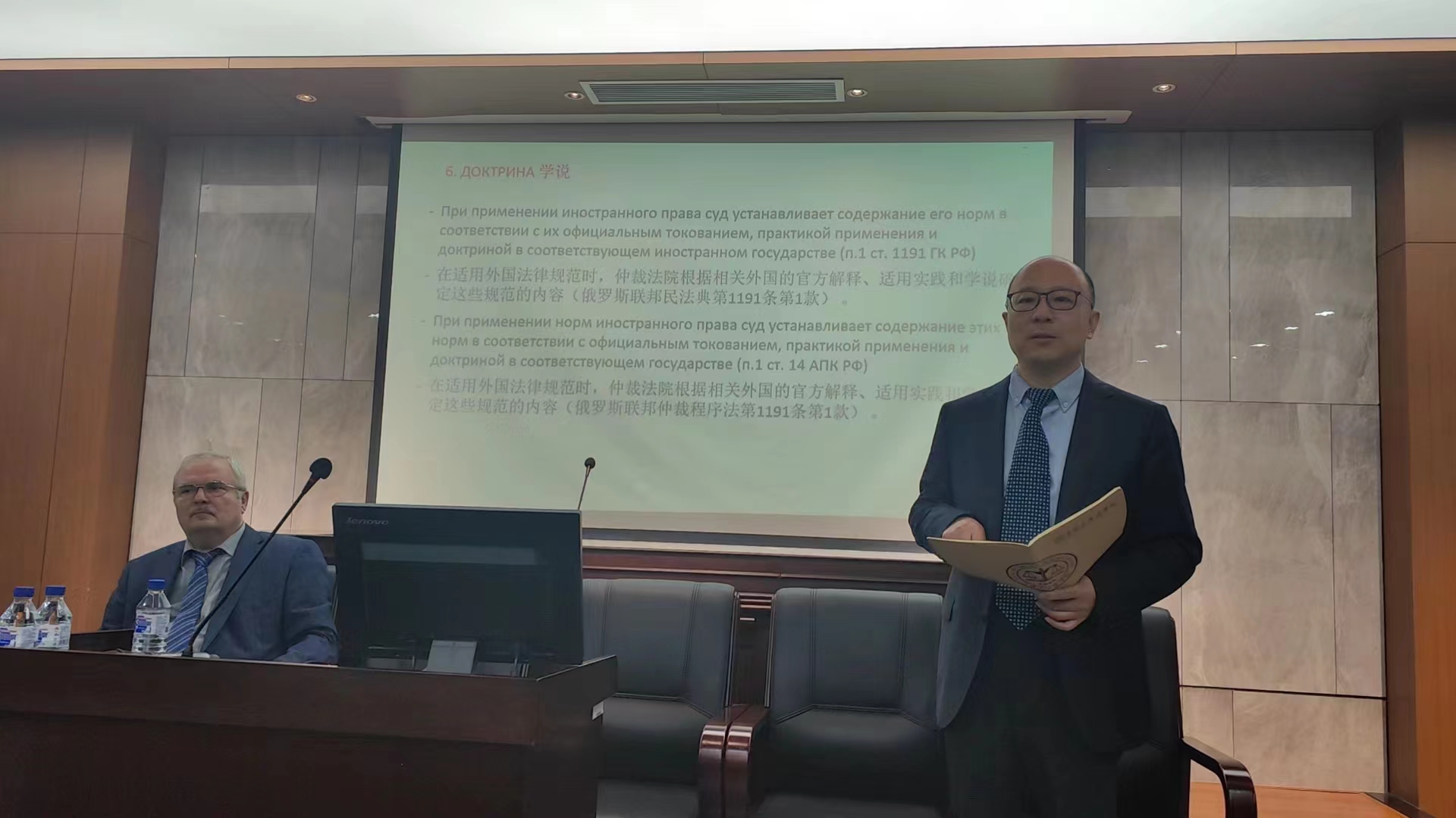 本次讲座以商业法渊源的概念和类型、法律规定、公认的国际法原则和规范、俄罗斯联邦的国际条约、习惯、司法实践和学说六个部分展开。Popondopulo Vladimir教授先以简洁的语言阐释了商业法渊源在狭义与广义上的概念。他指出当前对商业法渊源的争议主要集中在商业法的法律规定应采取一元私法体系还是二元私法体系。一元私法体系是指民法典加专门法律规定,二元私法体系是指民法典加商法典加专门法律。教授认为二元私法体系会增加商业法律体系的复杂性,导致法律的解释和适用都更加困难。公认的国际法原则和规范、俄罗斯联邦的国际条约(《俄罗斯联邦宪法》第15条第4款、《民法典》第7条、1995年《俄罗斯联邦国际条约联邦法》)也都是俄罗斯商业法的渊源。但二者在适用上存在一定差别。公认的国际法原则和规范可以直接适用,而俄罗斯联邦的国际条约则需经批准后才可以适用。其次,习惯也是俄罗斯商业法的渊源之一。习惯有如下标志:首先是法律未规定的行为准则;习惯不违反法律和合同的时候,习惯才适用;最后习惯是商业实践中广泛应用的行为规则。教授还指出司法实践作为法律渊源既包括对立法规范的司法解释行为,也包括公共关系法律调节行为。学说也是俄罗斯商业法渊源之一。在适用外国法律规范时,仲裁法院根据相关外国的官方解释、适用实践和学说确定规范的内容。