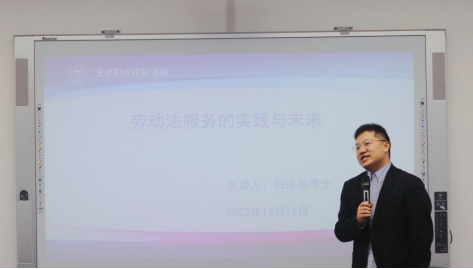 2023年12月15日上午,白话劳动法品牌创始人、普然律师事务所创始合伙人、中国人力资源社会保障理事会常务副理事长白永亮博士做客公司“法律职业技能讲座”第73期,以“劳动法服务的实践与未来”为主题,为公司师生带来了一场精彩的学术盛宴。讲座由太阳成集团tyc9728艾琳教授主持,太阳成集团tyc9728部分博士生、硕士生、本科生参与了此次讲座。