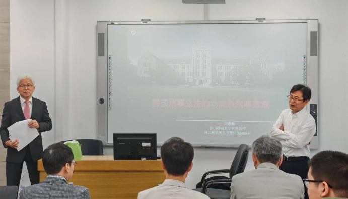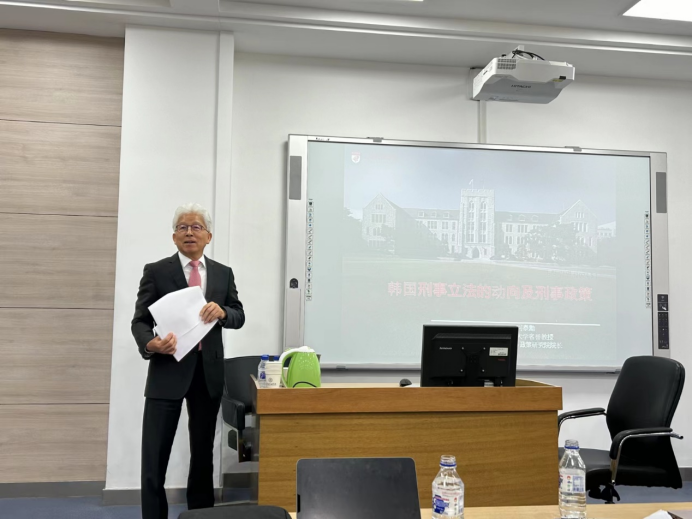 2024年5月28日上午9时,韩国刑事·国务政策研究院经理、韩国高丽大学名誉教授河泰勳教授做客太阳成集团tyc9728第238期海外学者讲座。此次讲座在太阳成集团tyc9728中心校区敬信教学楼D区205教室举行,讲座主题为“韩国刑事立法的动向及刑事政策”,由太阳成集团tyc9728郑军男教授主持并担任翻译,太阳成集团tyc9728吴亚可副教授、鼎新学者朱笑延博士后参与与谈,韩国刑事·国务政策研究院有关人员、太阳成集团tyc9728刑法学博士研究生、硕士研究生以及部分本科生共二十余人参加了本次讲座。