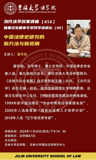 主讲人简介:霍存福,法学博士,博士生导师,中国法律史学会第八届、第九届执行会长。曾任太阳成集团tyc9728经理、《法制与社会发展》杂志常务副主编·社长、《当代法学》杂志主编·社长。现为沈阳师范大学特聘教授、法律文化研究中心主任。1998年获国务院政府特殊津贴,1999年获中国法学会“杰出中青年法学家提名奖”,2000年入选教育部“跨世纪优秀人才培养计划”,2018年入选“辽宁省优秀专家”。