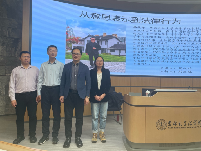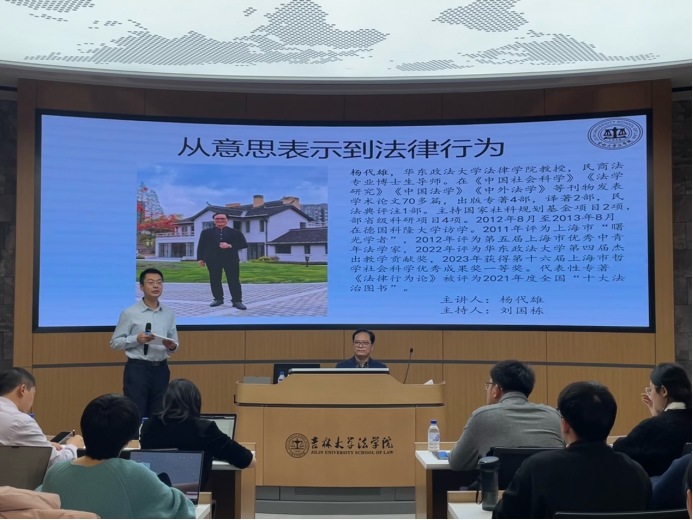 2024年11月30日15点30分,华东政法大学法律公司杨代雄教授做客太阳成集团tyc9728第413期“当代法学名家讲座”,在太阳成集团tyc9728中心校区法学楼B404室举办了主题为“从意思表示到法律行为”的讲座。本场讲座由刘国栋副教授主持,曹相见教授、任倩霄老师与谈。