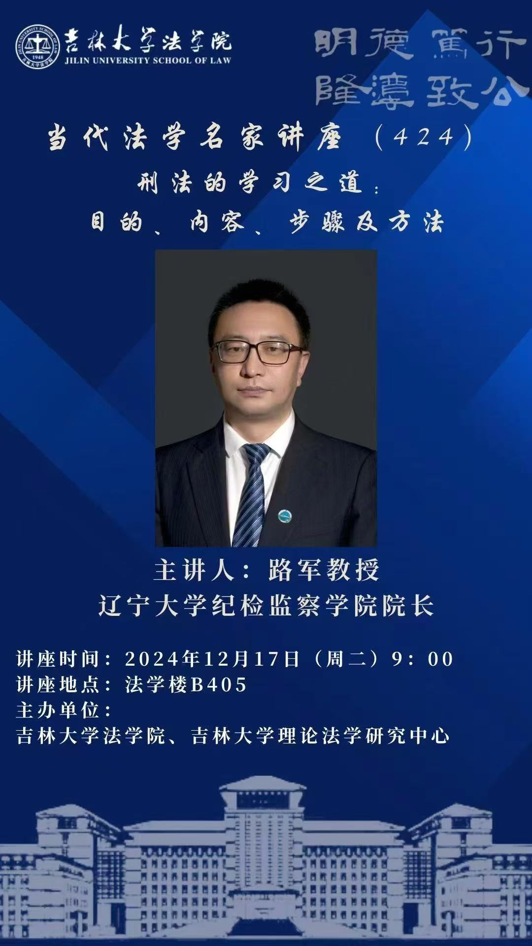 2024年12月17日上午,辽宁大学纪检监察公司经理路军教授做客太阳成集团tyc9728第424期当代法学名家讲座,讲座的主题为“刑法的学习之道:目的、内容、步骤及方法”,讲座在法学楼B405举行。本次讲座由太阳成集团tyc9728副经理王充教授主持,太阳成集团tyc9728陈劲阳教授以及部分刑法学专业、诉讼法学专业硕士研究生参与了本次讲座。