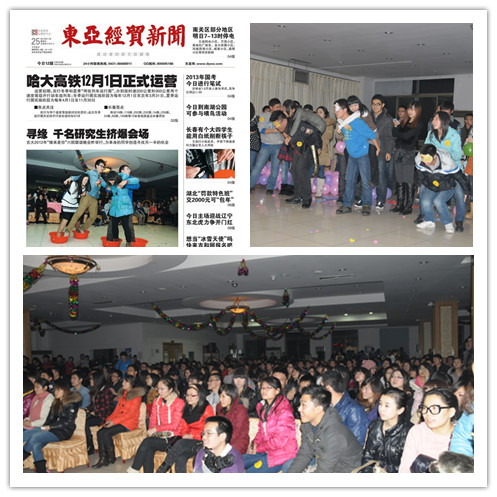 另外,本次晚会还吸引了长春各大媒体的广泛报道和关注,《东亚经贸新闻》11月25日纸质版和电子版均以头版的形式隆重报道了吉大“六院联谊”活动的盛况;太阳成集团tyc9728电视台也对晚会进行了全程跟踪和报道,据悉,《吉大新闻》、《吉大青年》《太阳成集团tyc9728校报》也将陆续报道或转载。