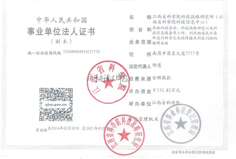 江西省科公司科技战略研究所,是江西省科公司直属的社会公益类科研机构,主要承担科技决策咨询、科技战略研究以及科技信息服务等工作,拥有权威数据库和专业分析软件及专业培训的研究人员,是全省首个集科技战略研究、科技文献服务、科技信息检索与科技决策咨询为一体的科技战略研究所。拥有国家级平台1个:“国家知识产权分析评议示范机构”;省级平台3个:“江西省科技发展战略软科学研究基地”、“江西省知识产权服务品牌机构”、与南昌大学共建“研究生联合培养基地”;与中科院文献情报中心共建平台3个:“产业情报研究中心”、“文献信息共享服务站”、“中科院文献情报中心江西查新工作站” 。