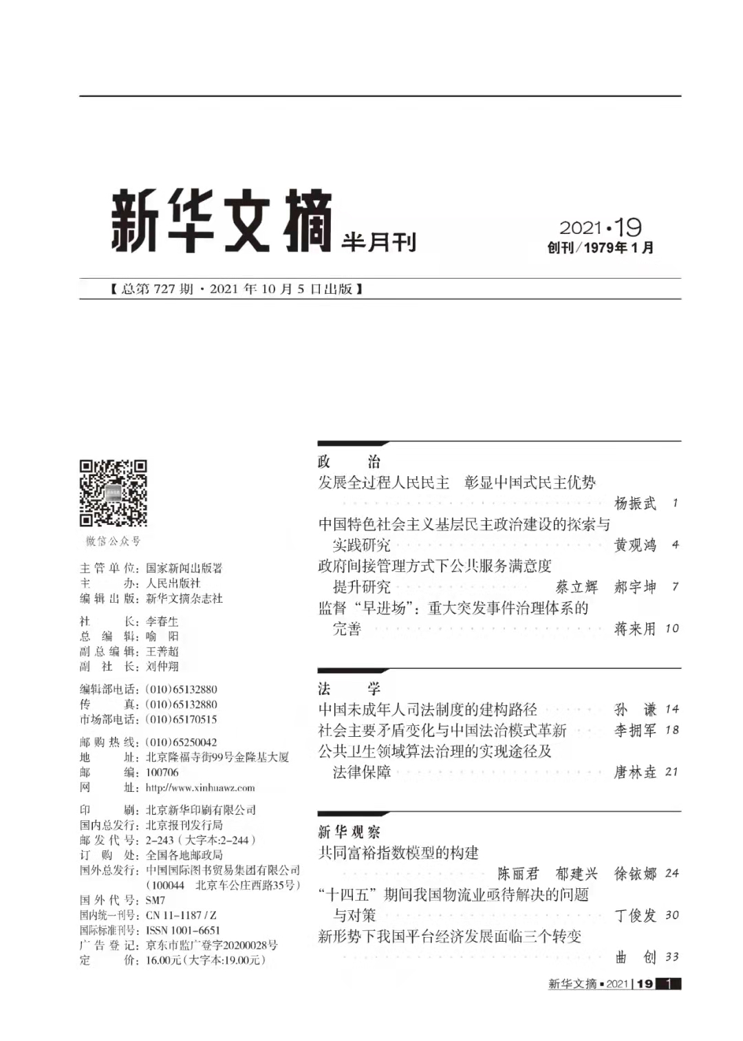 李拥军教授发表在《学习与探索》2021年第5期的“社会主要矛盾变化与中国法治模式革新”一文被《新华文摘》2021年第19期全文转载。该文认为,中国社会主要矛盾不断变化的过程是中国法治开始成长并不断走向成熟的过程。主要矛盾的变化要求国家在治理方式上必须进行必要的变革。当下中国的国家治理要以法治的方式来实现,因此,社会主要矛盾的变化必然会引发当代中国法治模式的变革。人民日益增长的美好生活需要和不平衡、不充分的发展之间的矛盾决定了,中国社会需要高质量发展,而高质量的社会发展需要高质量的国家治理方式,而高质量的治理方式必然表现为法治的现代化。在此目标下,当下中国应该在重塑法律体系格局、提升权利保护的“量”与“质”、健全社会公平公正机制、强化防控手段在法律实施中的作用、完善风险责任制度体系方面做出变革。