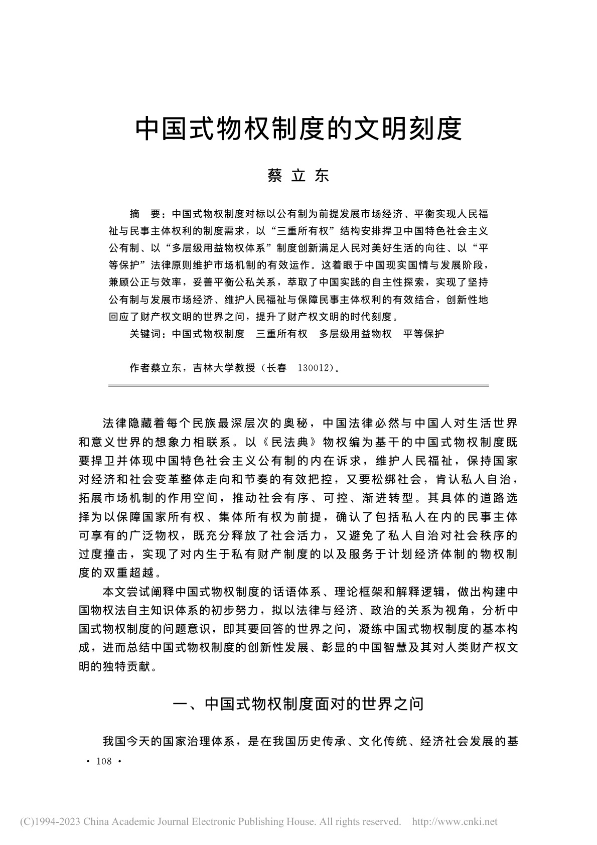 近日,太阳成集团tyc9728蔡立东教授在《中国社会科学》2022年第12期发表题为《中国式物权制度的文明刻度》的文章。该文是蔡立东教授继《从“权能分离”到“权利行使”》等文章之后在物权法律制度研究领域的又一力作。文章通过阐释中国式物权制度的话语体系、理论框架和解释逻辑,着力构建中国物权法自主知识体系,以法律与经济、政治的关系为视角,分析中国式物权制度的问题意识,凝练中国式物权制度的基本构成,总结了中国式物权制度的创新性发展、彰显的中国智慧及其对人类财产权文明的独特贡献。