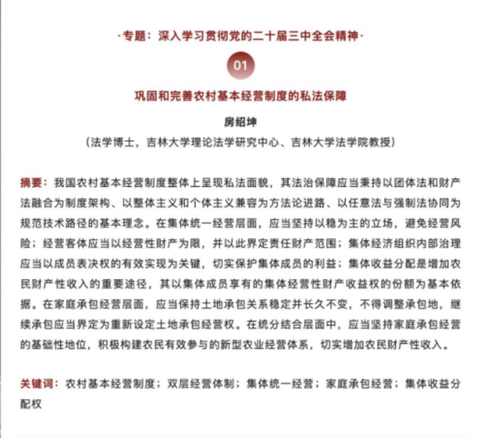 公司房绍坤教授在《法学家》发表学术成果《巩固和完善农村基本经营制度的私法保障》