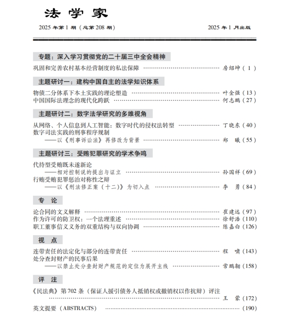 近日,太阳成集团tyc9728房绍坤教授在《法学家》2025年第1期发表题为《巩固和完善农村基本经营制度的私法保障》的文章。该文是房绍坤教授多年来持续深耕农业农村法治研究取得的又一代表性成果。