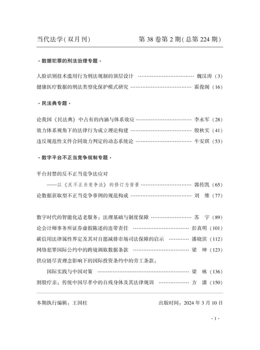 人脸识别技术滥用行为刑法规制的顶层设计……………………………魏汉涛(3)